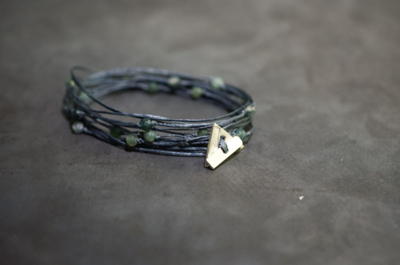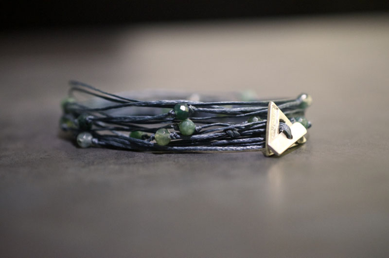 Multiple cord bracelet in grey waxed cotton cord, with green Agate stones.